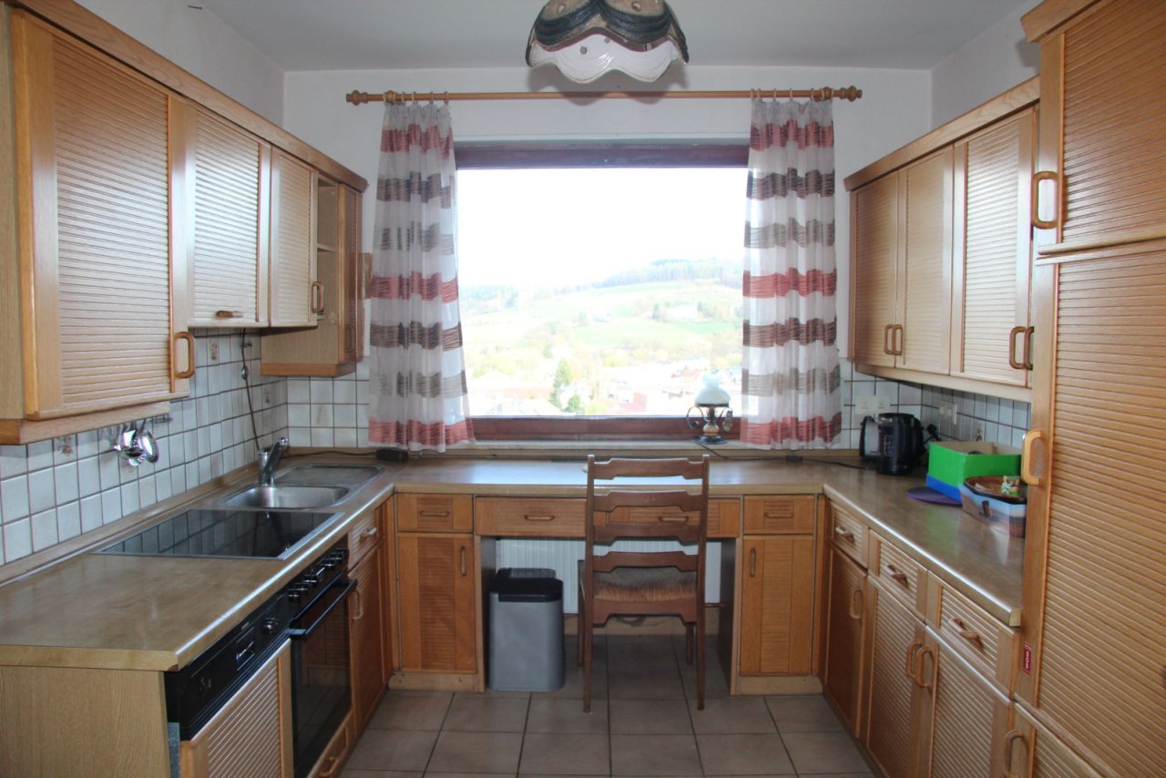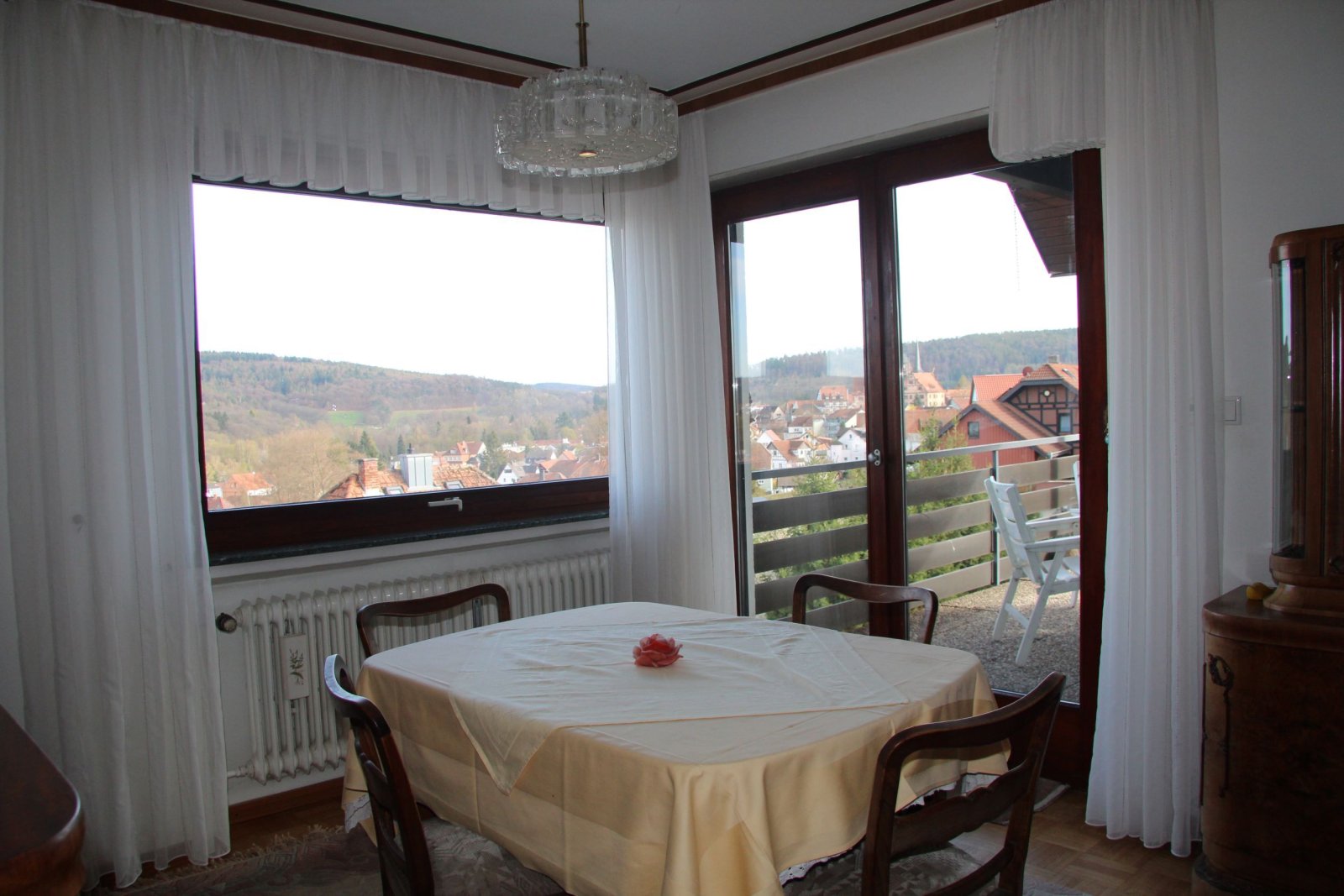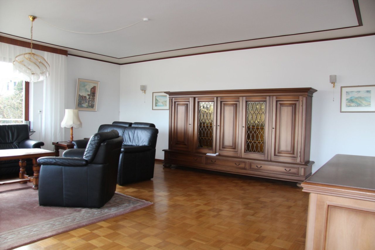 Das Erdgeschoss bietet ca. 150 m² Wohnfläche und eine klassische, familienfreundliche Aufteilung: Windfang, Diele, Flur, Gäste-WC sowie ein großzügiges Wohnzimmer mit beeindruckendem Fernblick. Zusätzlich stehen ein Esszimmer, eine Küche, ein Schlafzimmer, zwei Kinderzimmer und ein Badezimmer zur Verfügung. Der Balkon lädt zum Entspannen mit Weitblick ein.